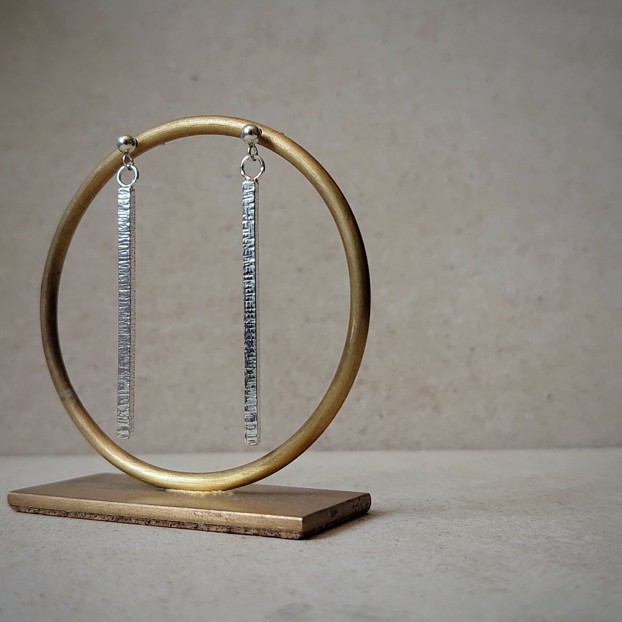 Simple yet statement earrings. An eye-catching length with a bark textured effect that reflects the light beautifully. The bar drop will move as you move, a gorgeous sparkling synergy. The bar has a square profile and hangs from a minimal ball stud. Unusual enough to start a conversation, minimal enough that they will complement any outfit. So versatile, I designed these to be so loved that you'll want to wear them over and over. The quality is there to make them last too - handmade from scratch each time in recycled sterling silver.